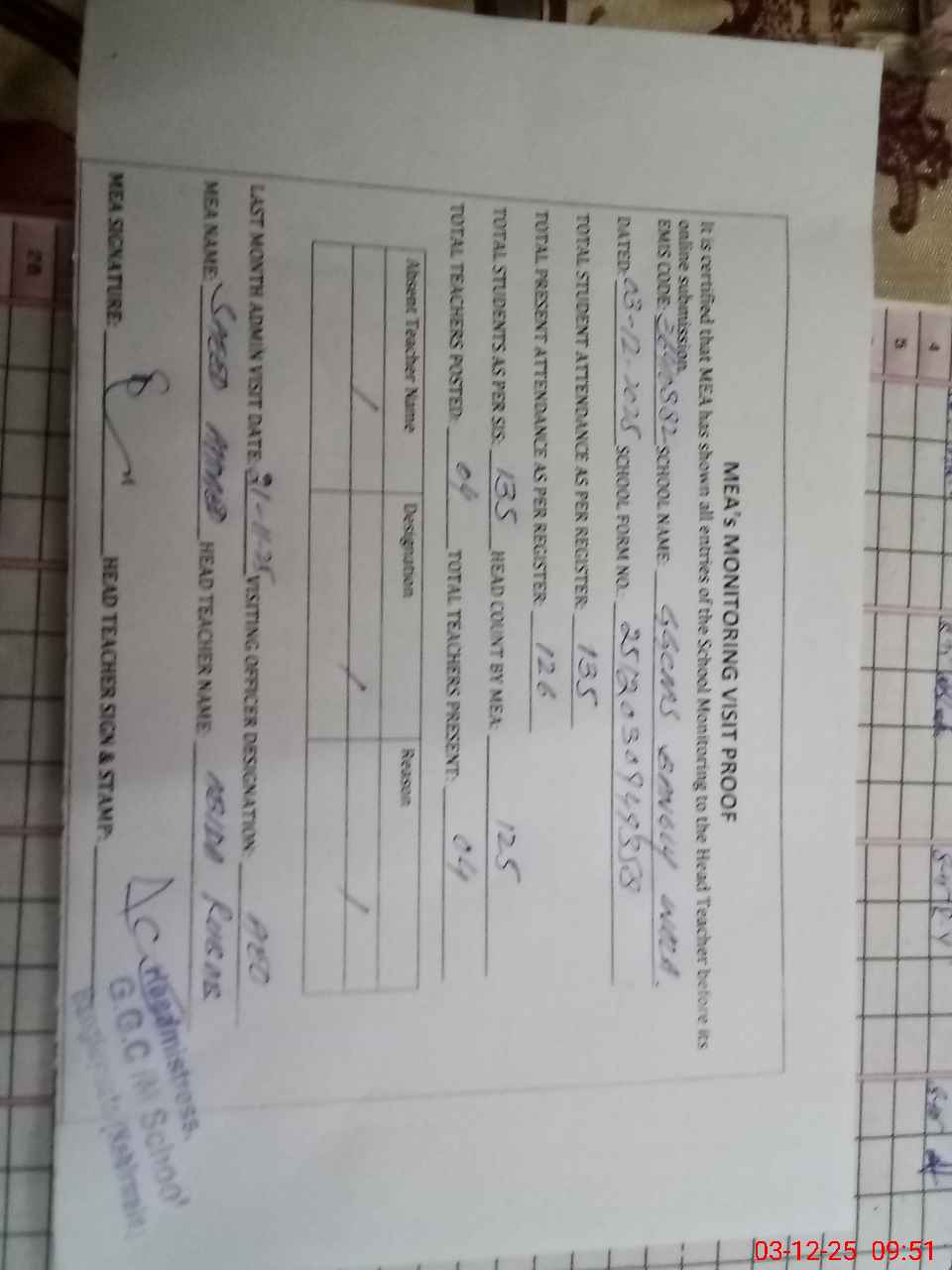 | Attendance Register | Head Teacher | MEA with School | Visit Proof |