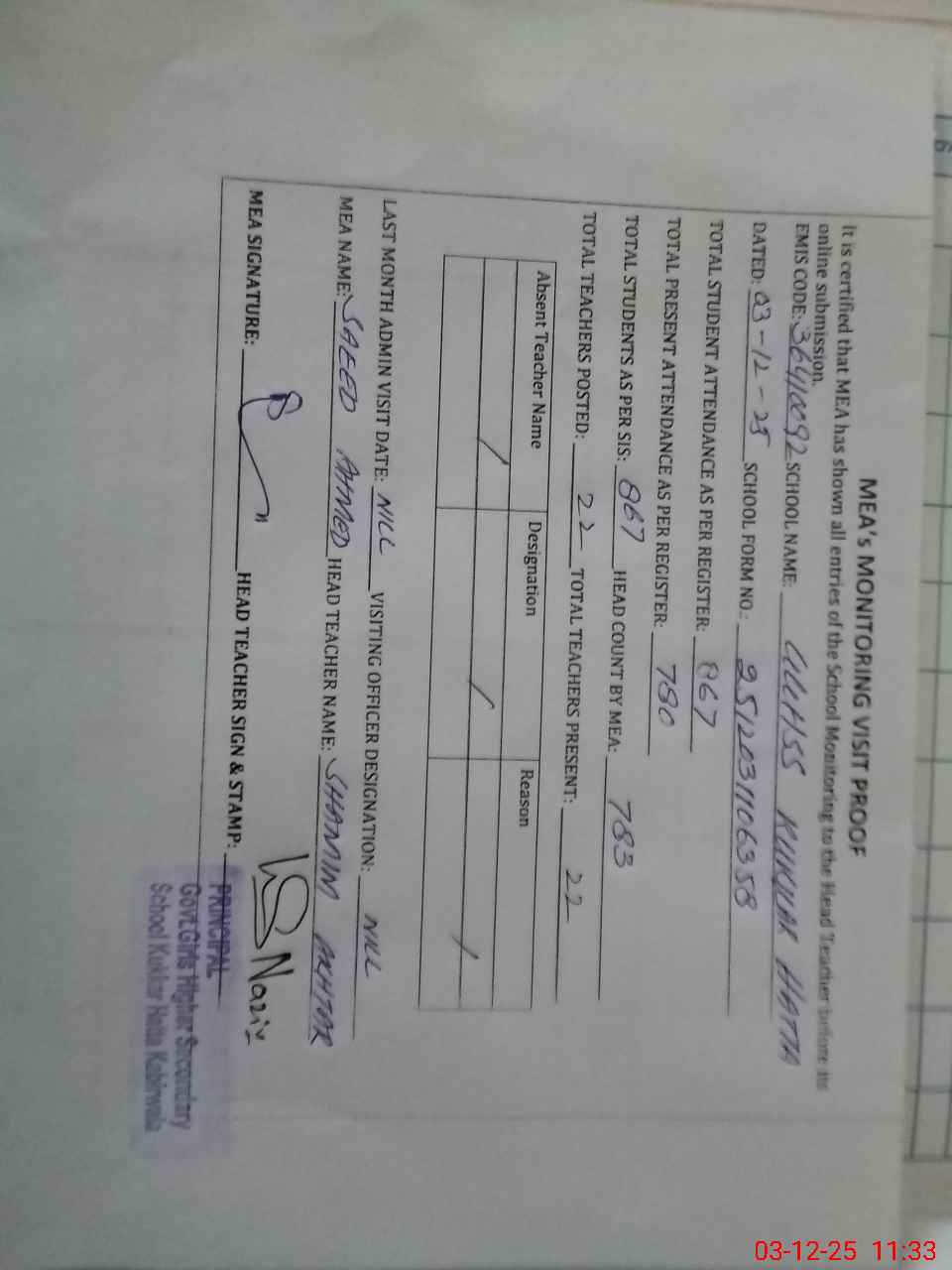 | Attendance Register | Head Teacher | MEA with School | Visit Proof |
