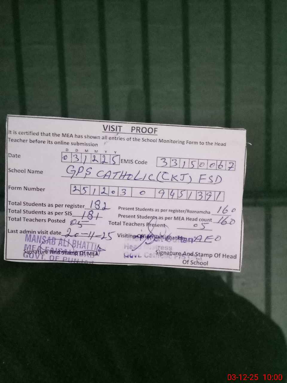 | EMIS Code: 33150067 | Name of School: GPS CATHOLIC CHAK JHUMRA | |||