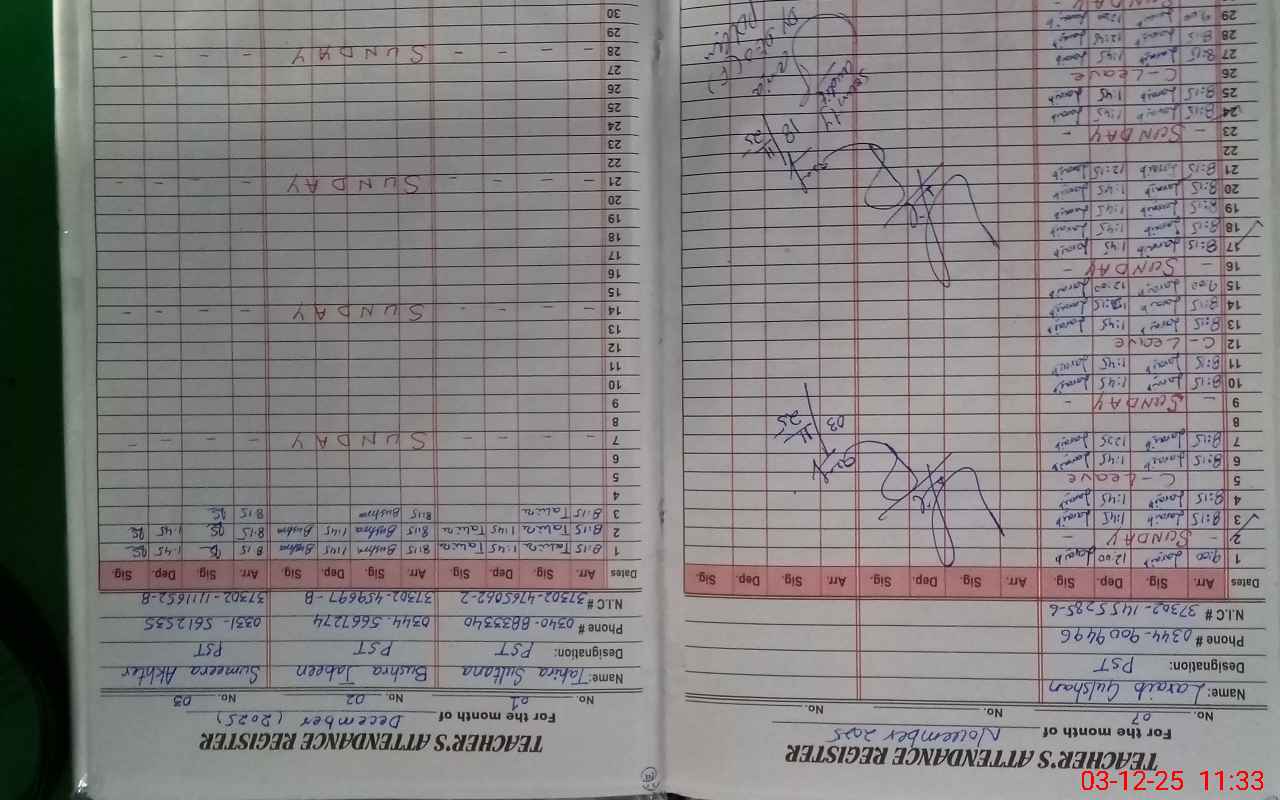| CNIC | Full Name | Designation | R/C | Absence During Last Calender Month |