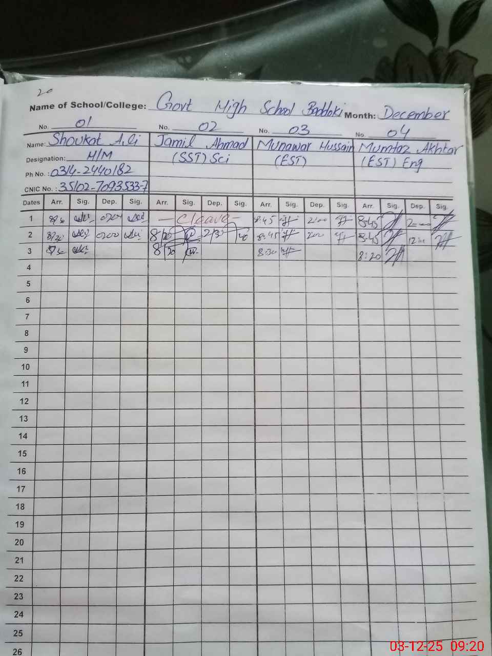 | Name: Sh**** Al**** Designation: (School Headmaster's/Headmistress's) Incharge Head Master Phone/Cell Number: 03**** |
