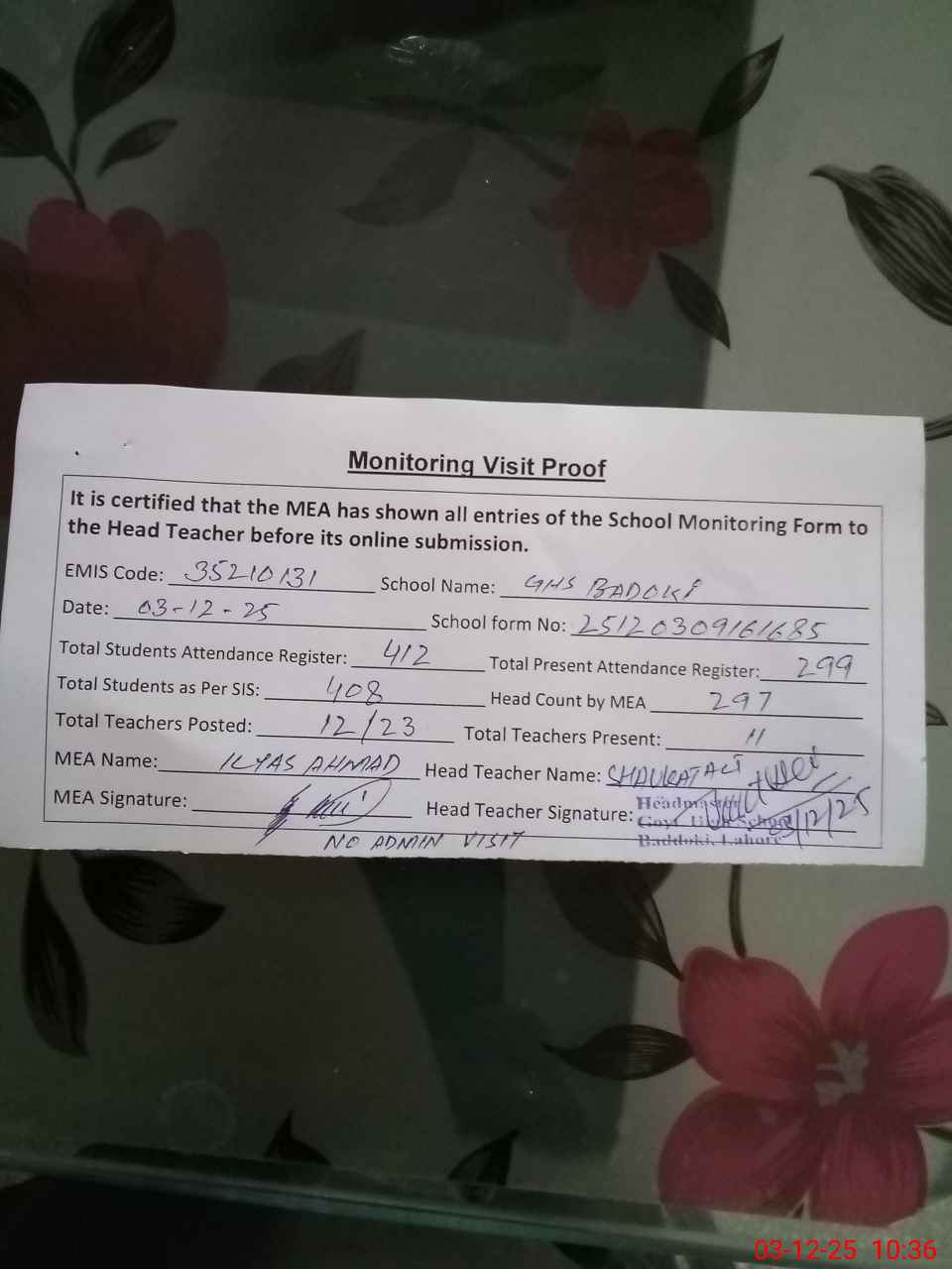 | Attendance Register | Head Teacher | MEA with School | Visit Proof |