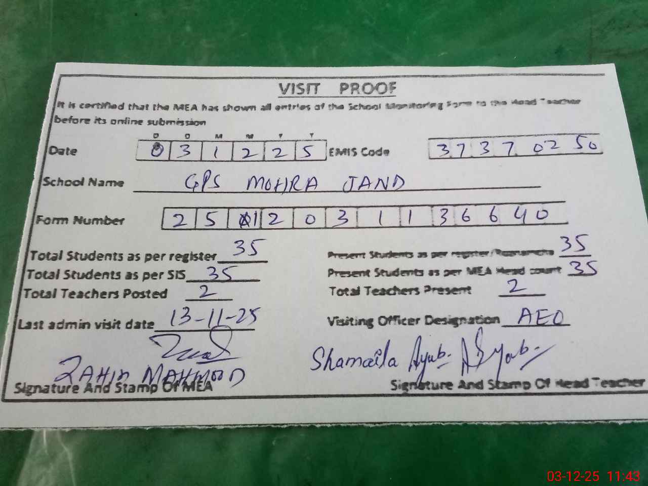 | EMIS Code: 37370250 | Name of School: GPS MOHRA JAND | |||