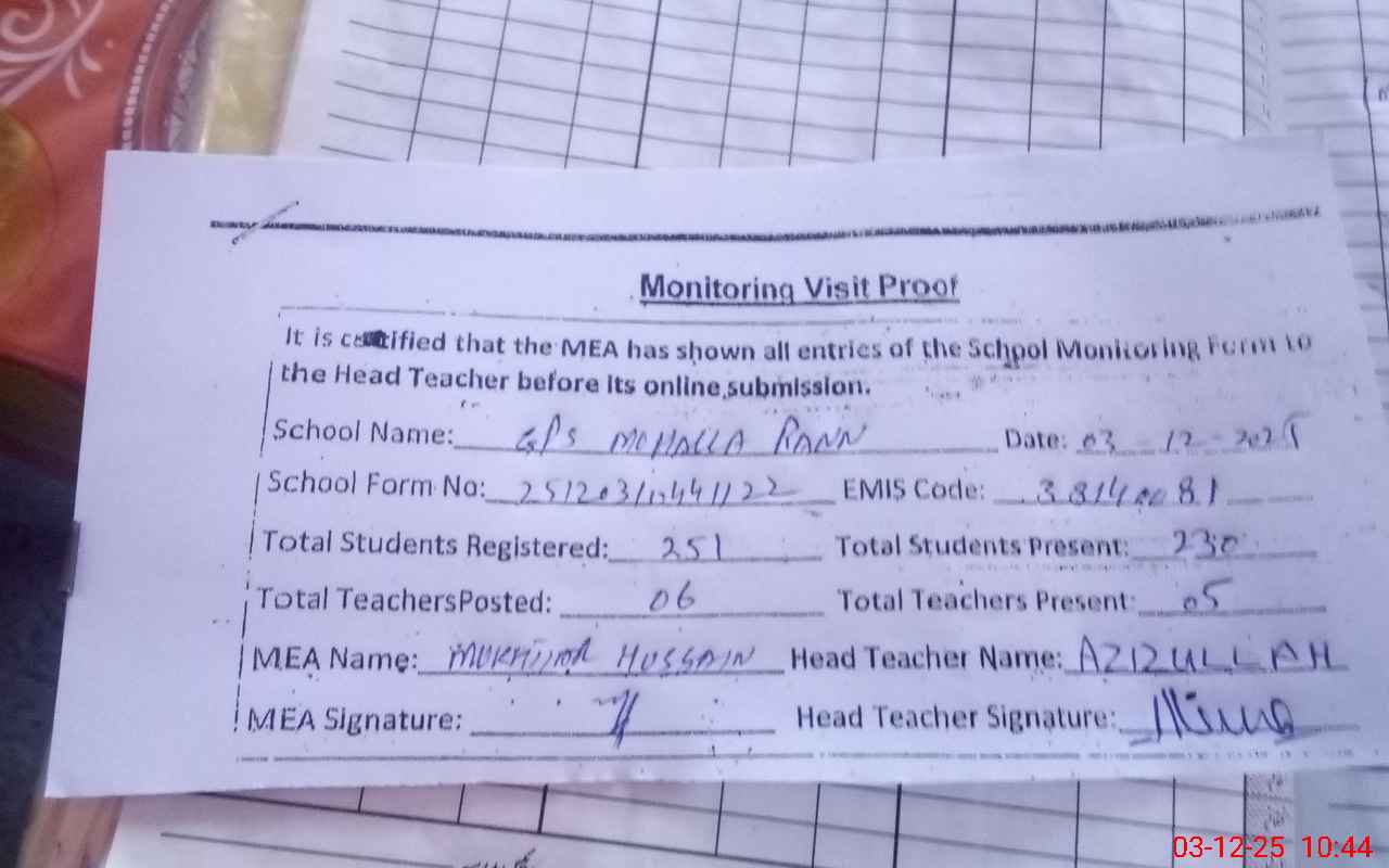 | EMIS Code: 38140081 | Name of School: GPS MOHALLA RANN | |||