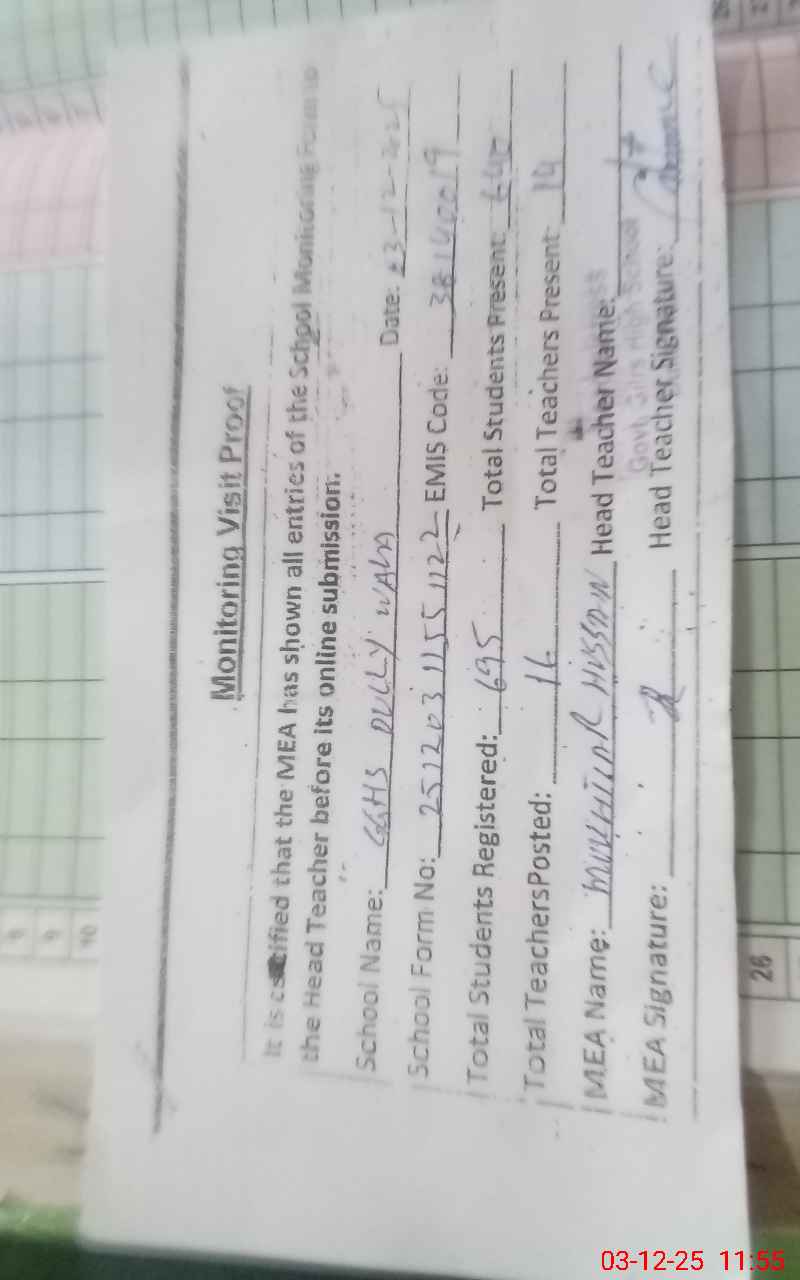 | EMIS Code: 38140019 | Name of School: GGHS DULLY WALA | |||