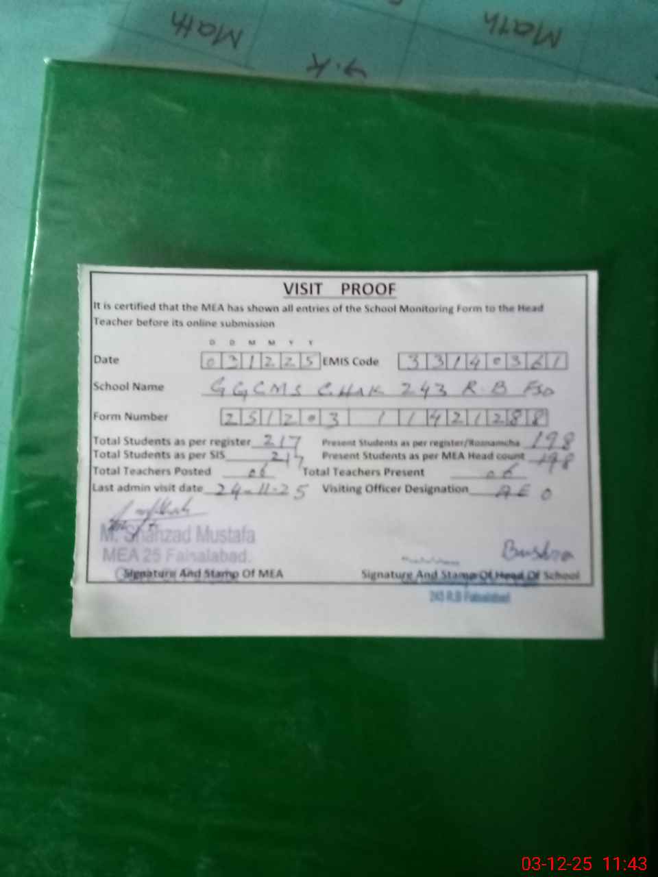 | Attendance Register | Head Teacher | MEA with School | Visit Proof |