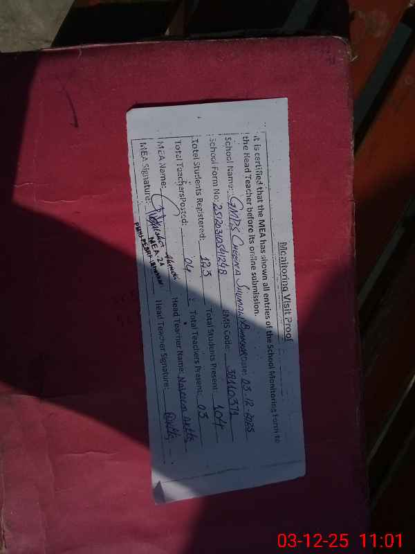 | Attendance Register | Head Teacher | MEA with School | Visit Proof |
