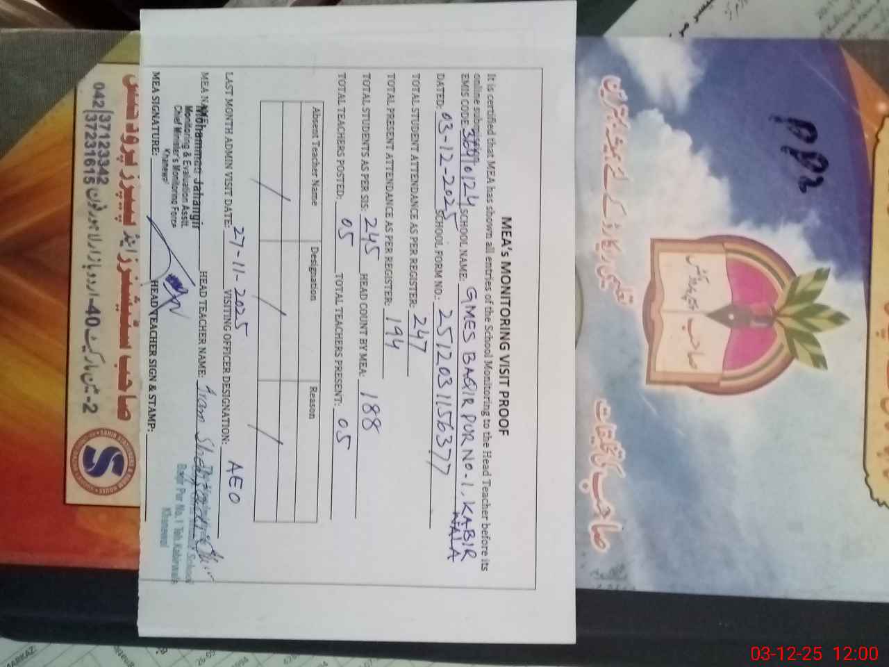 | Certified that this School was Inspected by the Undersigned MEA/DMO Today and the Information Stated Above is as Per Record. | |||||