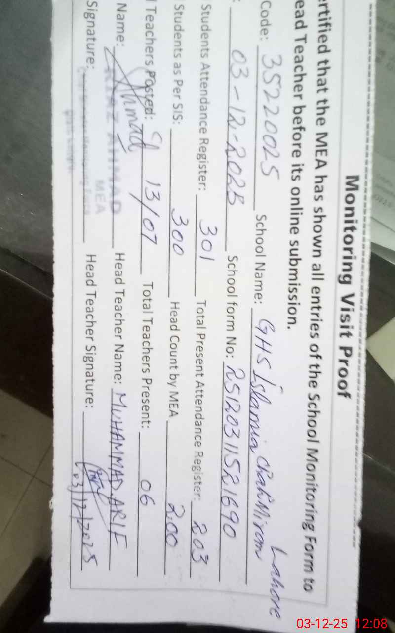 | EMIS Code: 35220025 | Name of School: GHS ISLAMIA CHAH MIRAN | |||