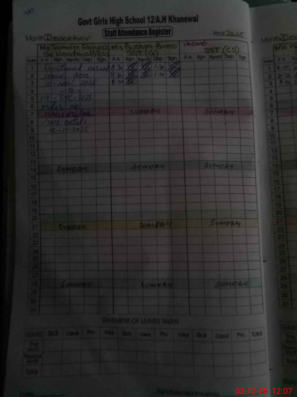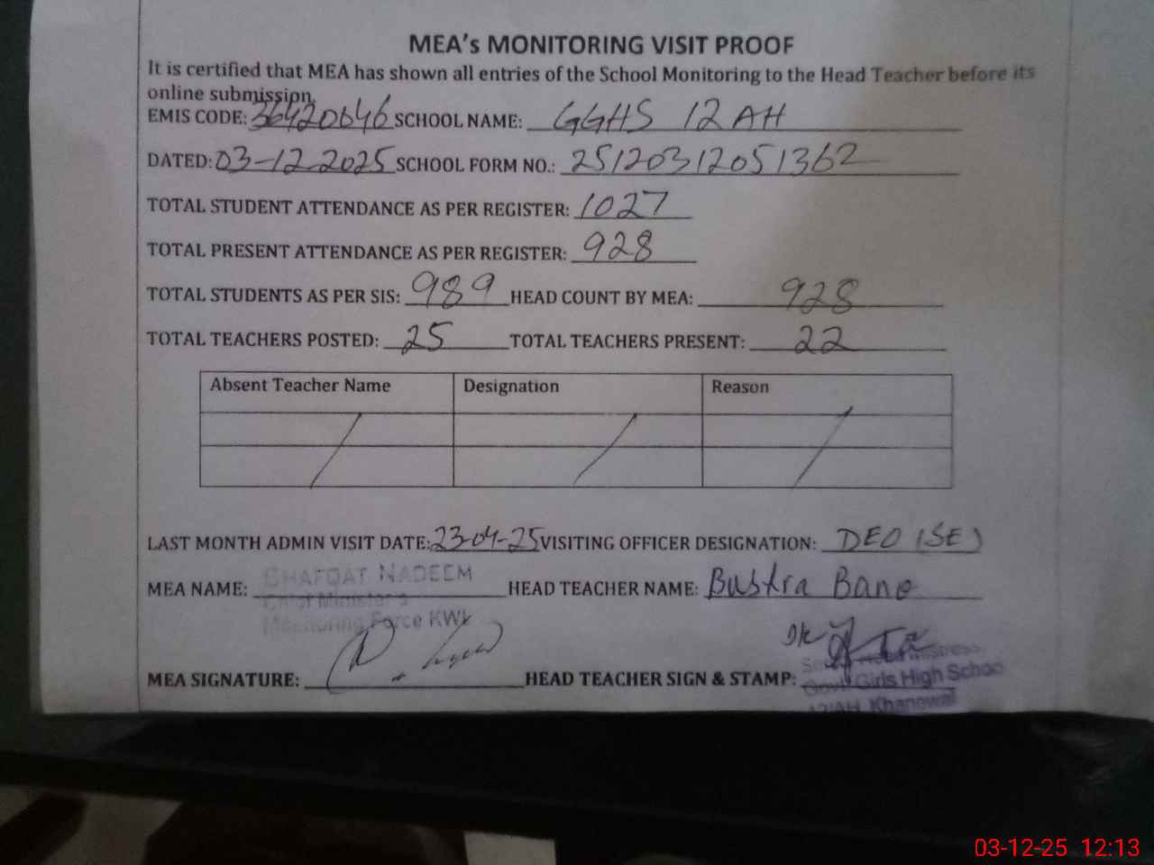 | EMIS Code: 36420046 | Name of School: GGHS 12/AH, KHANEWAL | |||