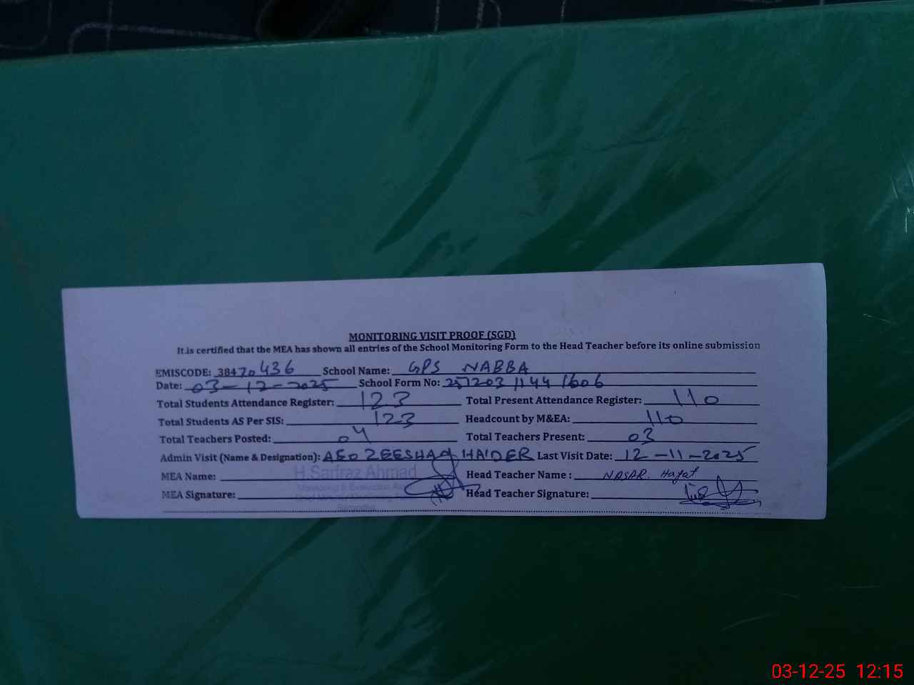 | Attendance Register | Head Teacher | MEA with School | Visit Proof |