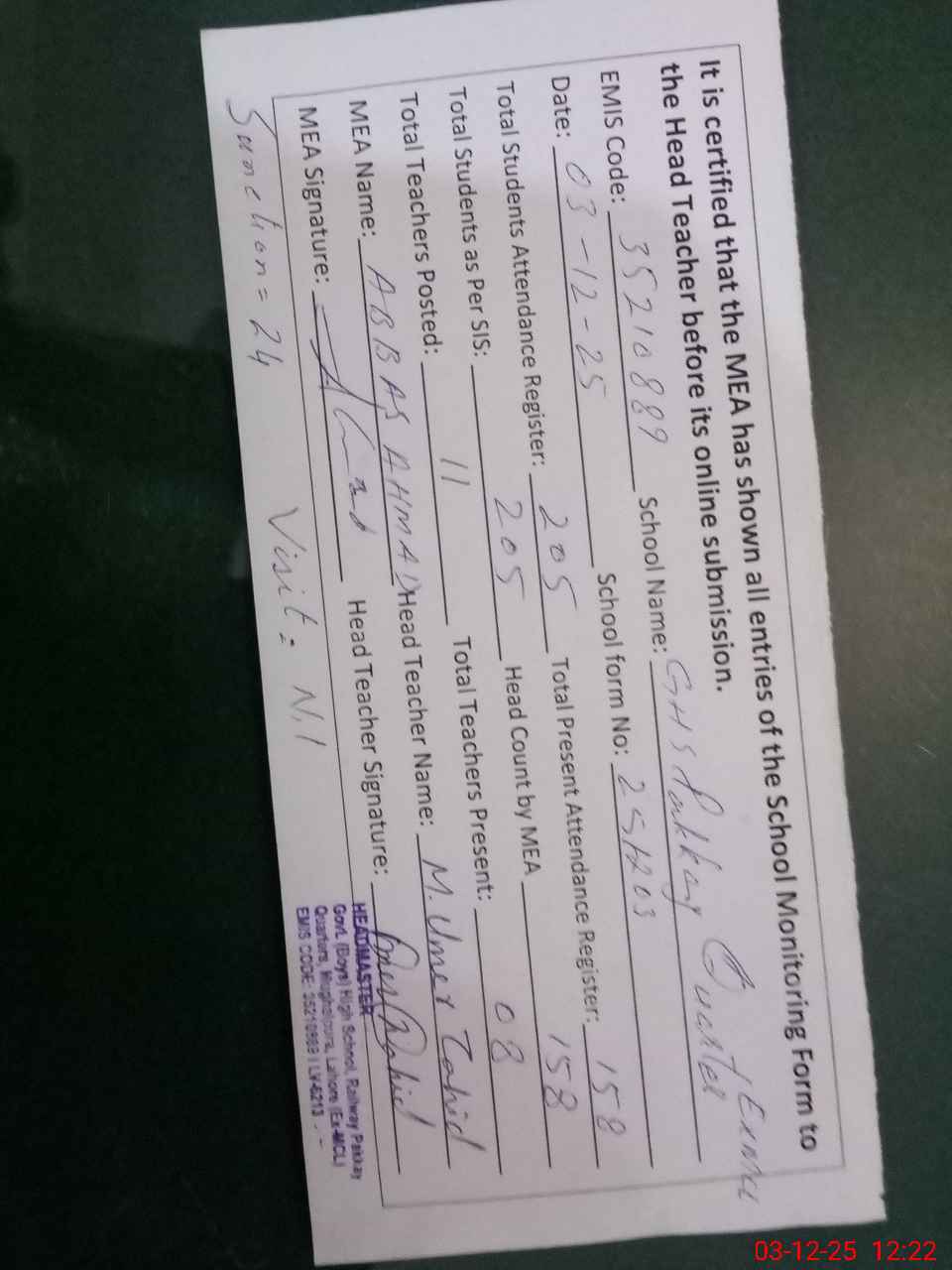 | EMIS Code: 35210889 | Name of School: GHS RAILWAY PAKKAY QUARTERS MUGHAL PURA (EX-MCL) | |||