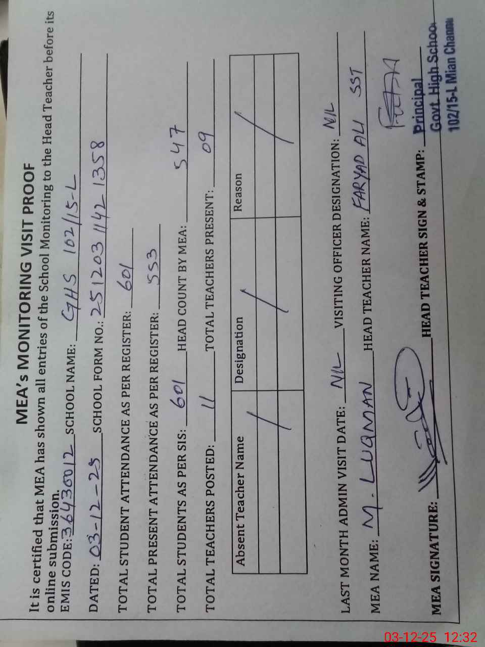 | Attendance Register | Head Teacher | MEA with School | Visit Proof |
