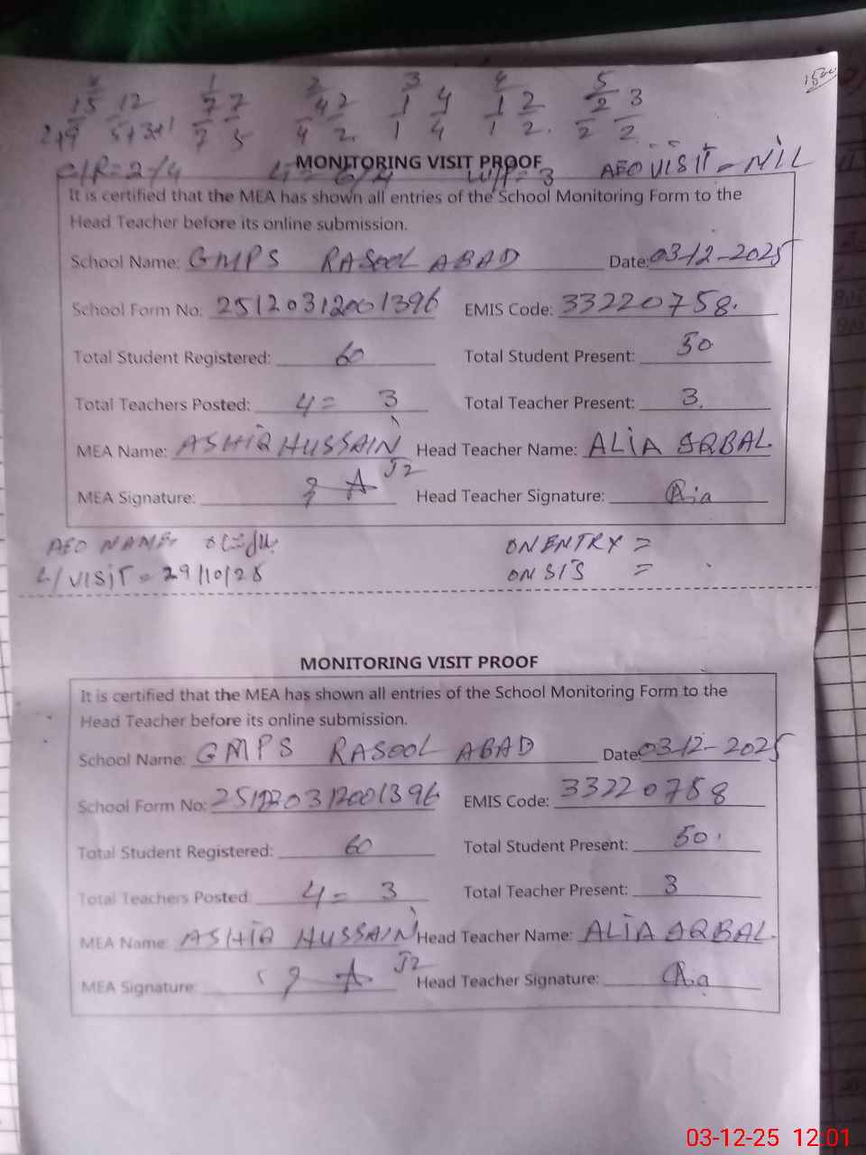 | EMIS Code: 33220758 | Name of School: GMPS RASOOL ABAD | |||