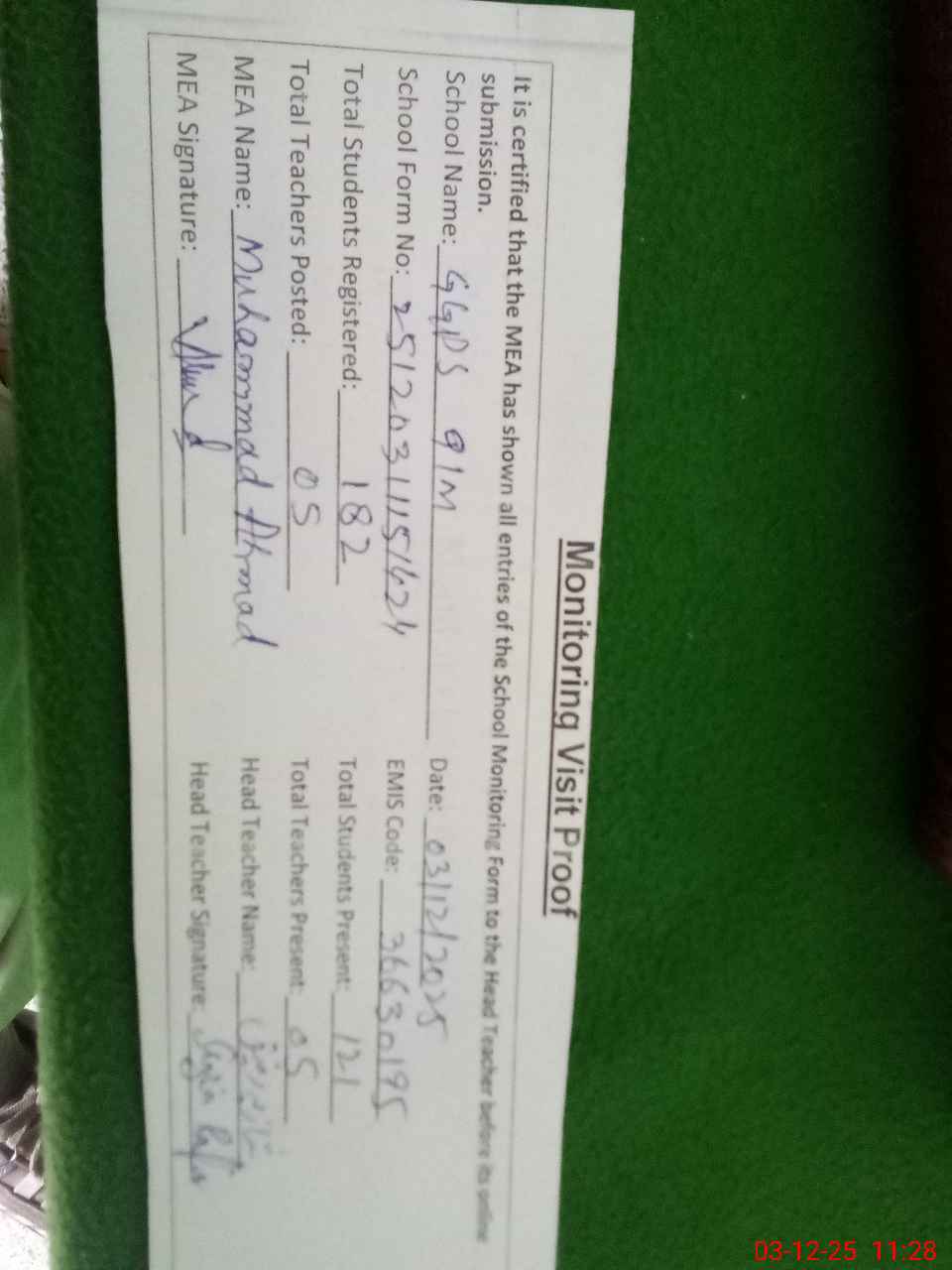 | Attendance Register | Head Teacher | MEA with School | Visit Proof |