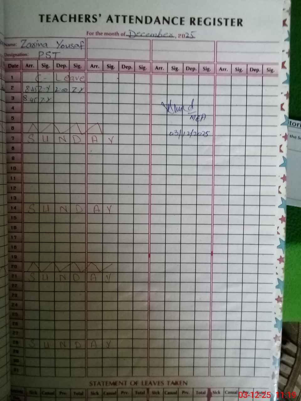 | CNIC | Full Name | Designation | R/C | Absence During Last Calender Month |