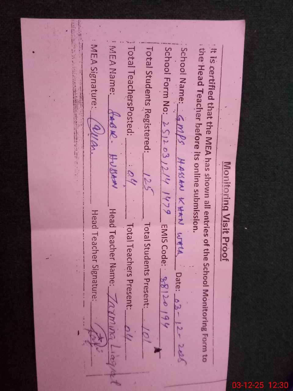 | EMIS Code: 38120194 | Name of School: GMPS HUSSAN KHAN WALA | |||