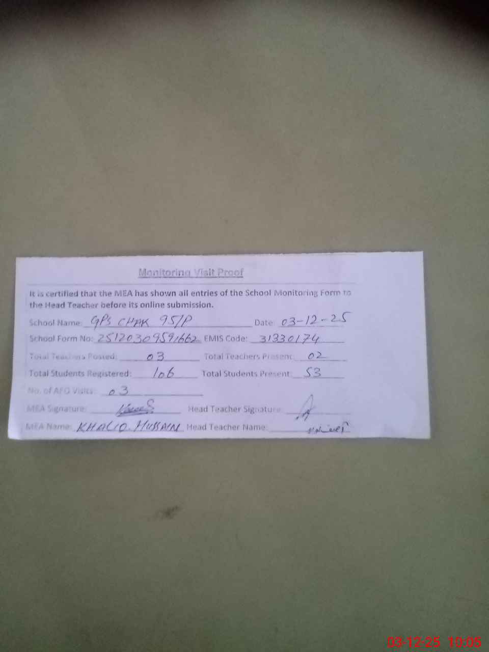 | Attendance Register | Head Teacher | MEA with School | Visit Proof |