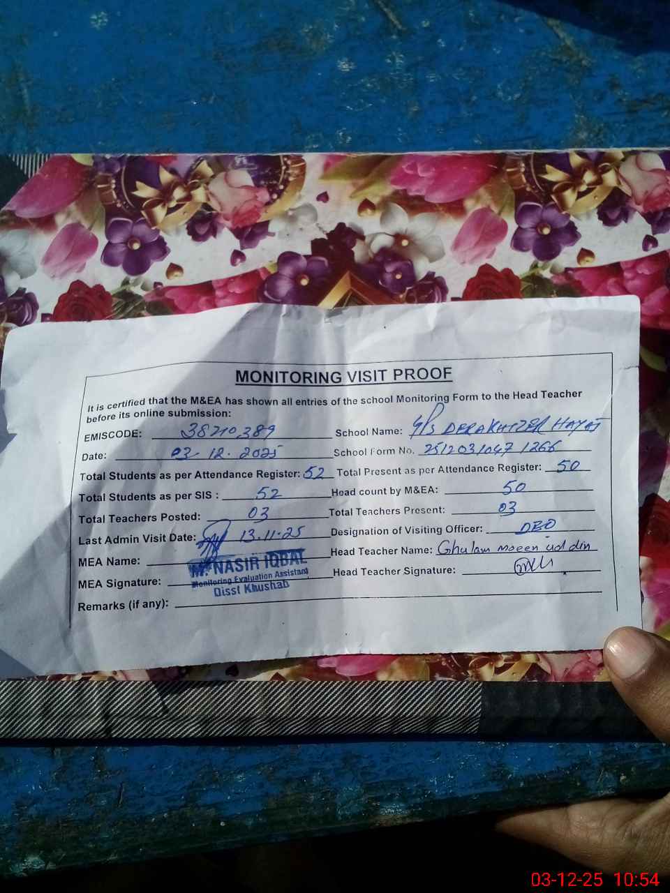| EMIS Code: 38210389 | Name of School: GPS DERA KHIZAR HAYAT | |||