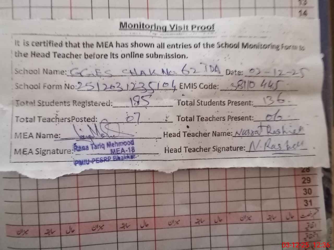 | Attendance Register | Head Teacher | MEA with School | Visit Proof |
