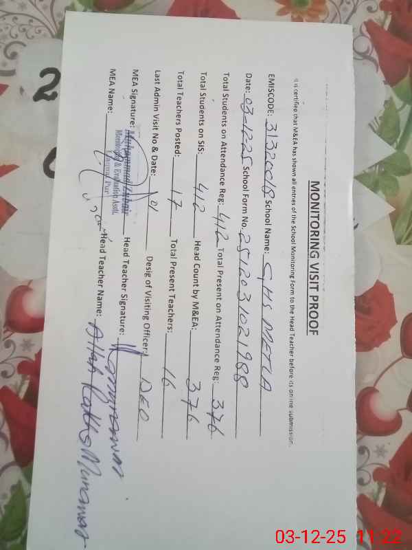 | Certified that this School was Inspected by the Undersigned MEA/DMO Today and the Information Stated Above is as Per Record. | |||||