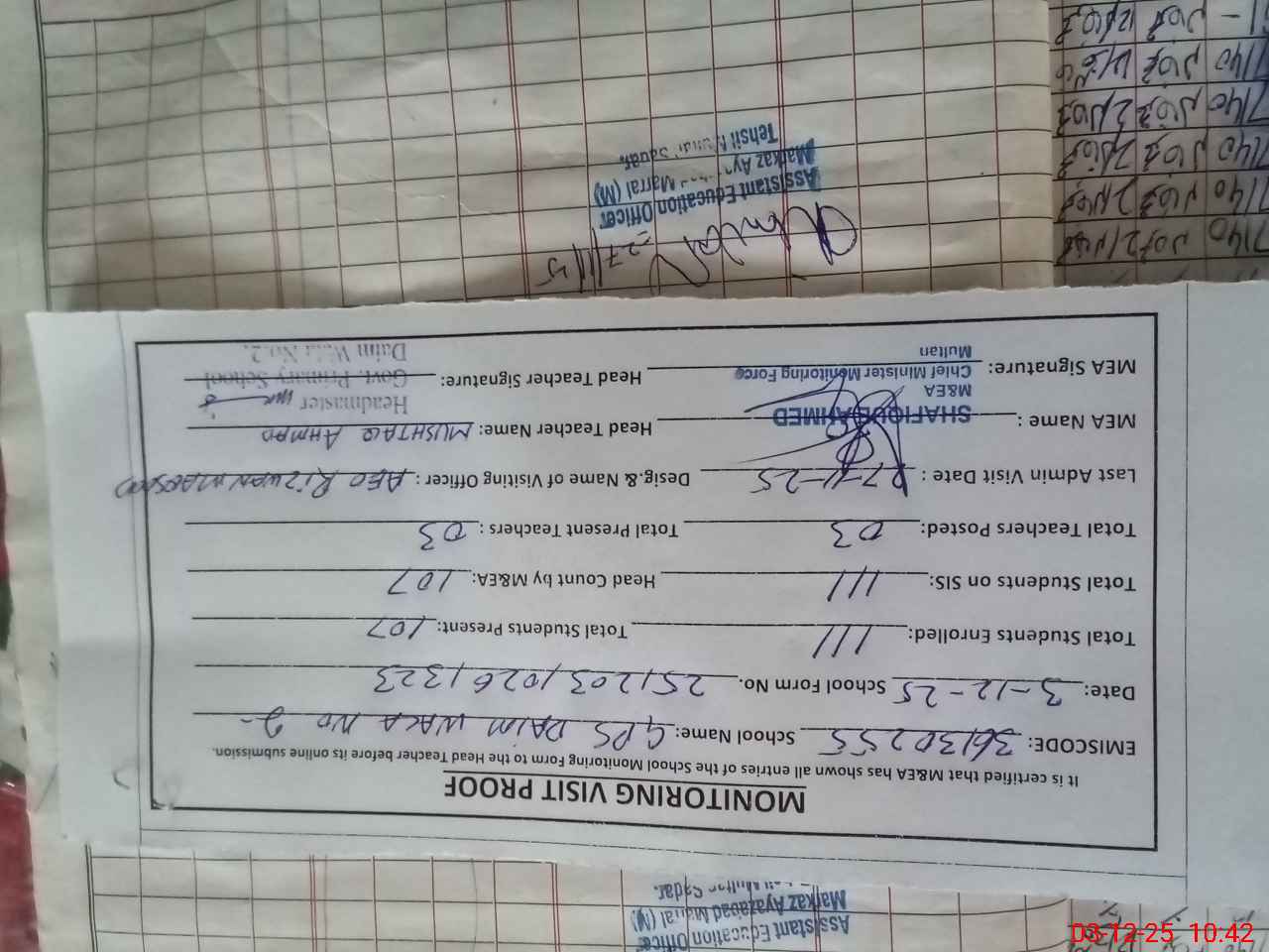| Attendance Register | Head Teacher | MEA with School | Visit Proof |