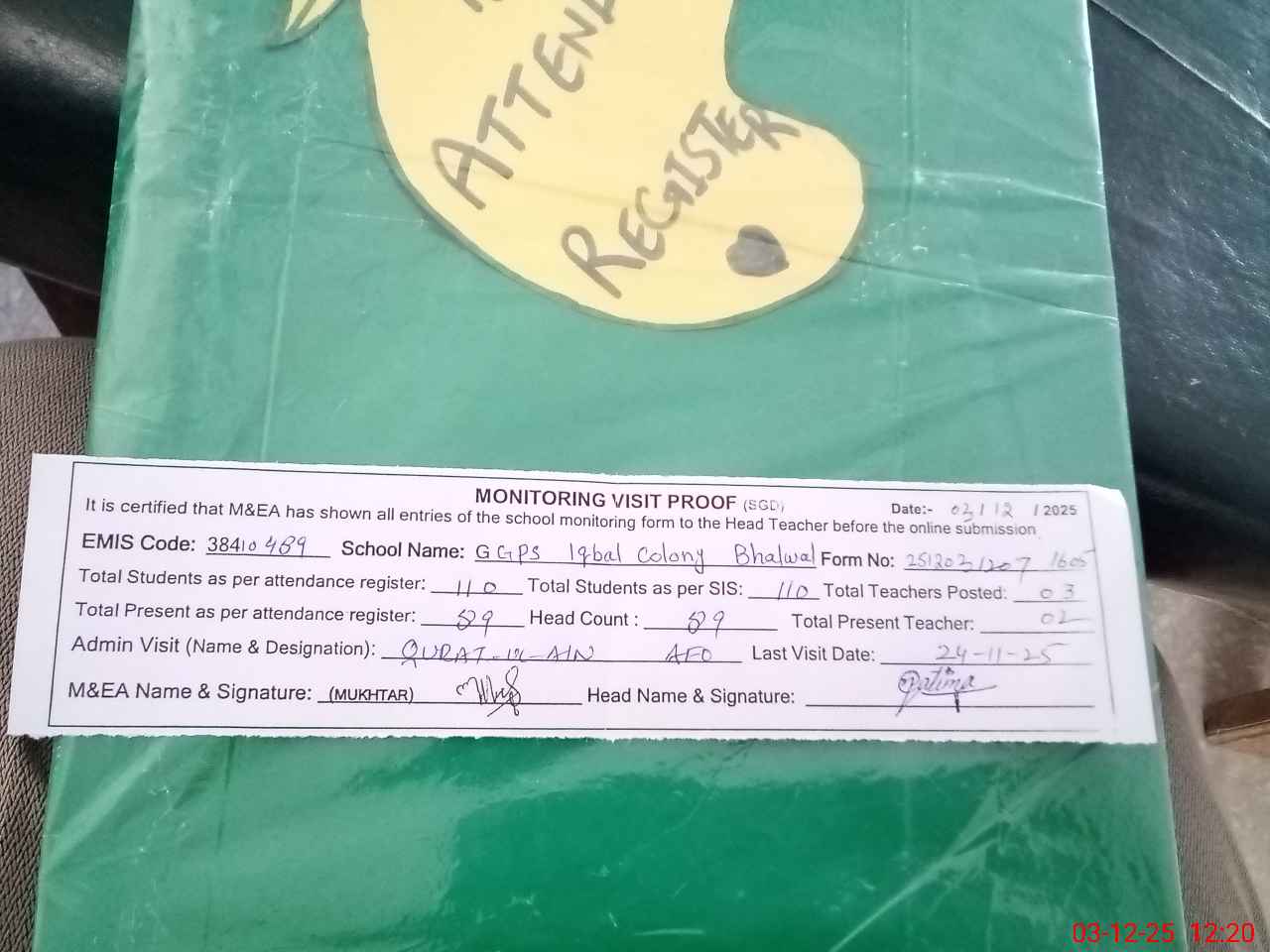 | Attendance Register | Head Teacher | MEA with School | Visit Proof |