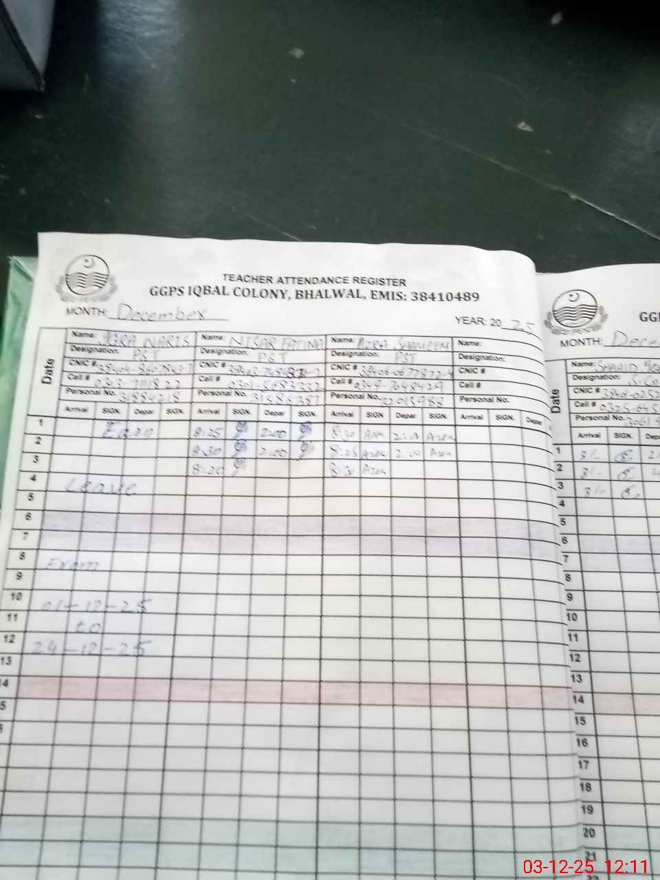 | CNIC | Full Name | Designation | R/C | Absence During Last Calender Month |