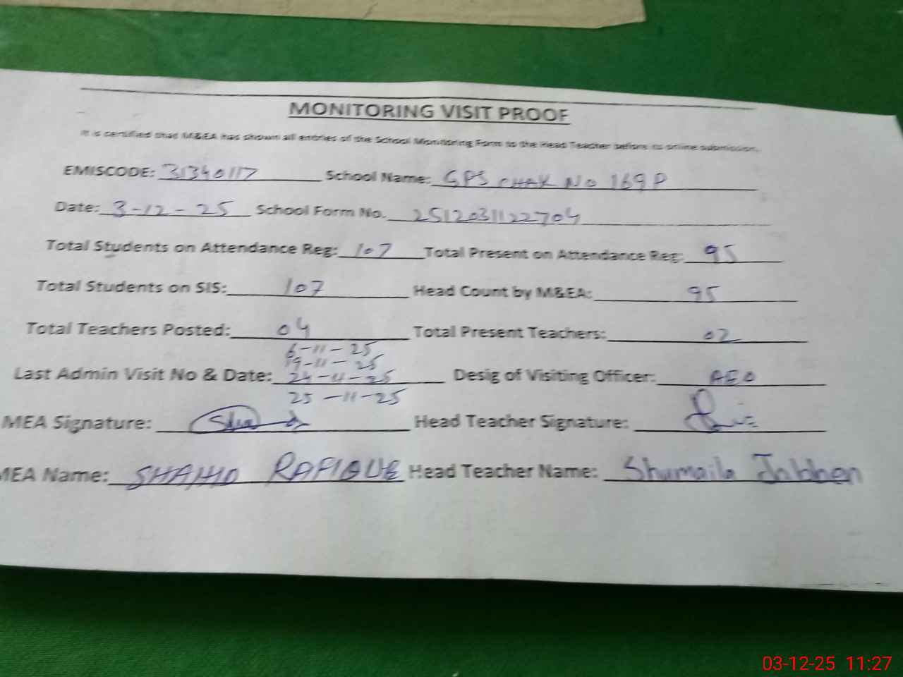 | Attendance Register | Head Teacher | MEA with School | Visit Proof |