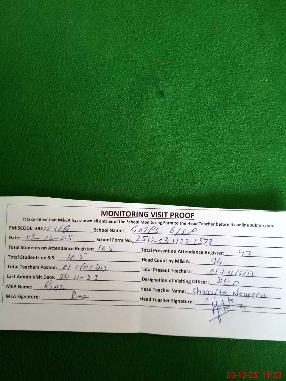 | Attendance Register | Head Teacher | MEA with School | Visit Proof |