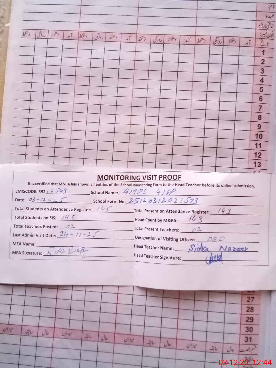 | EMIS Code: 39210543 | Name of School: GMPS CHAK NO. 4/SP | |||