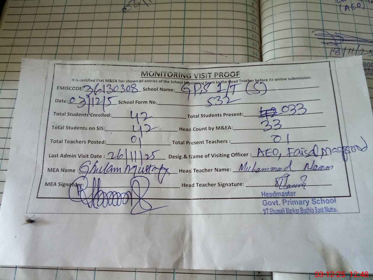 | Attendance Register | Head Teacher | MEA with School | Visit Proof |
