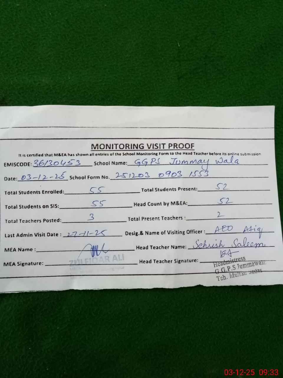 | Attendance Register | Head Teacher | MEA with School | Visit Proof |