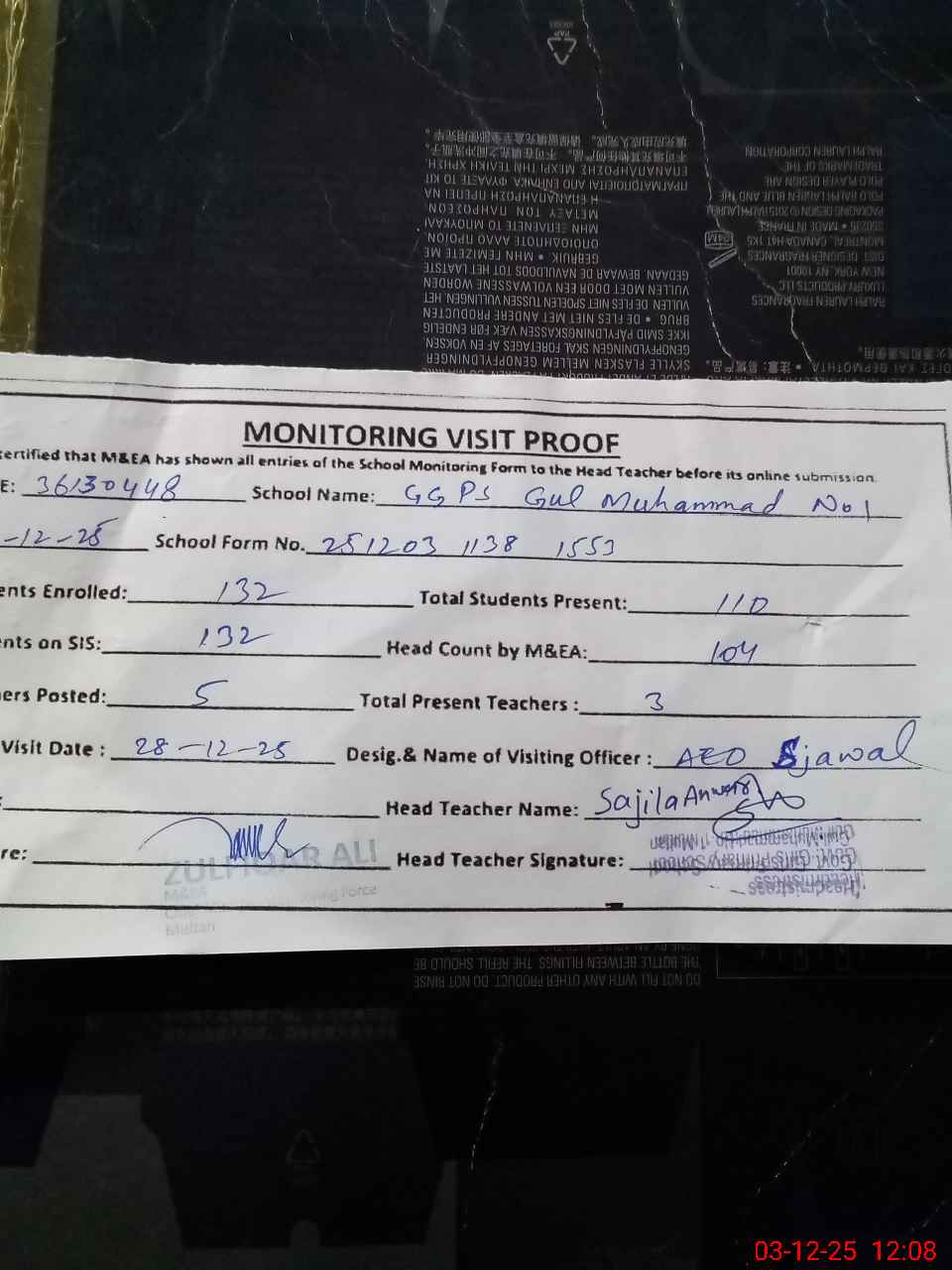 | Attendance Register | Head Teacher | MEA with School | Visit Proof |