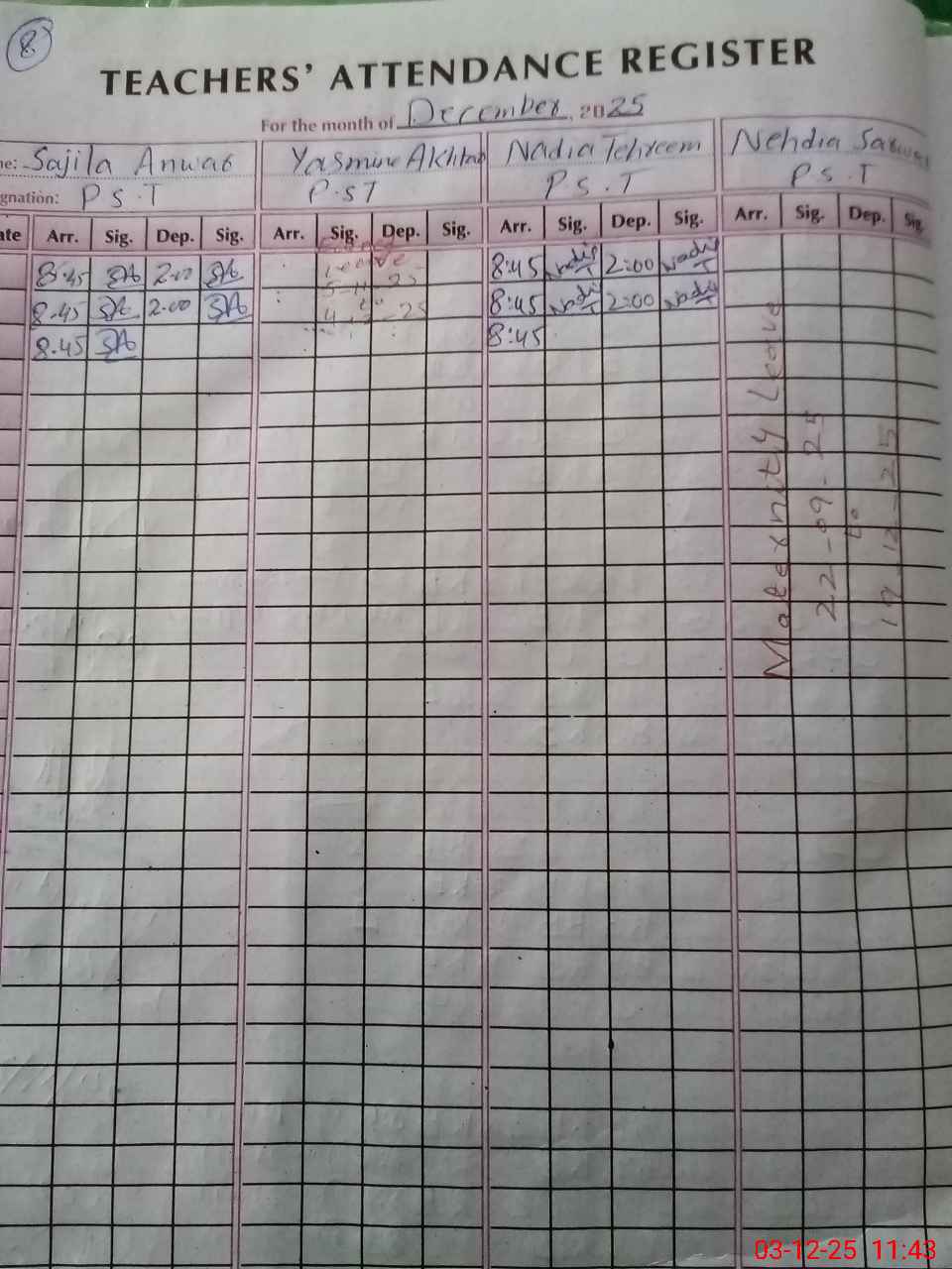 | 35**** | Ne**** Sa**** | PST Science/Maths | Regular | 0 | 0 | 0 | 0 | 0 | 0 | 0 | 0 | 0 | Maternity |