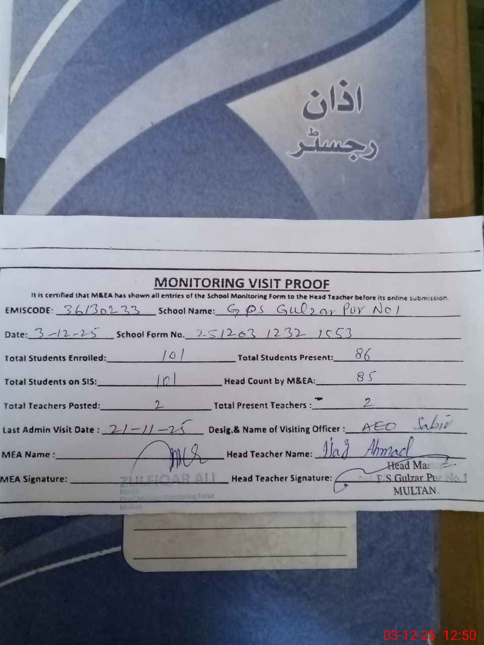 | EMIS Code: 36130233 | Name of School: GPS GULZAR PUR NO.1 P/O GULZAR PUR | |||
