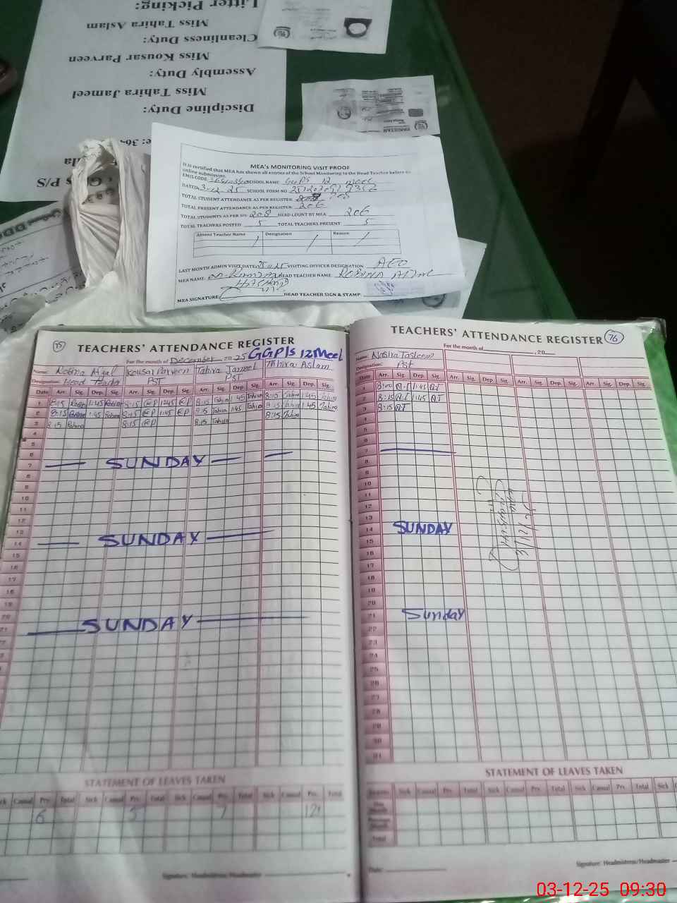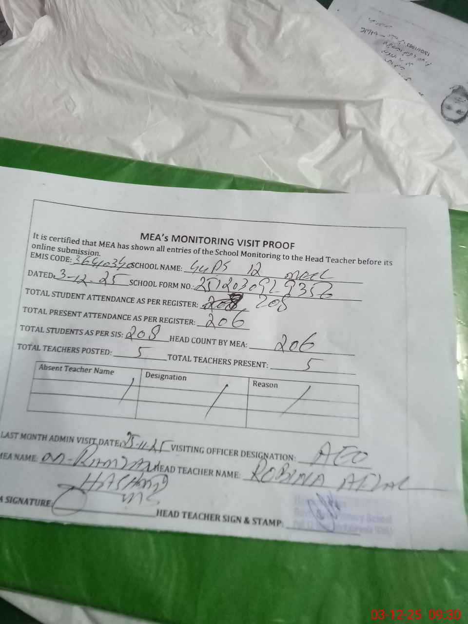 | Attendance Register | Head Teacher | MEA with School | Visit Proof |