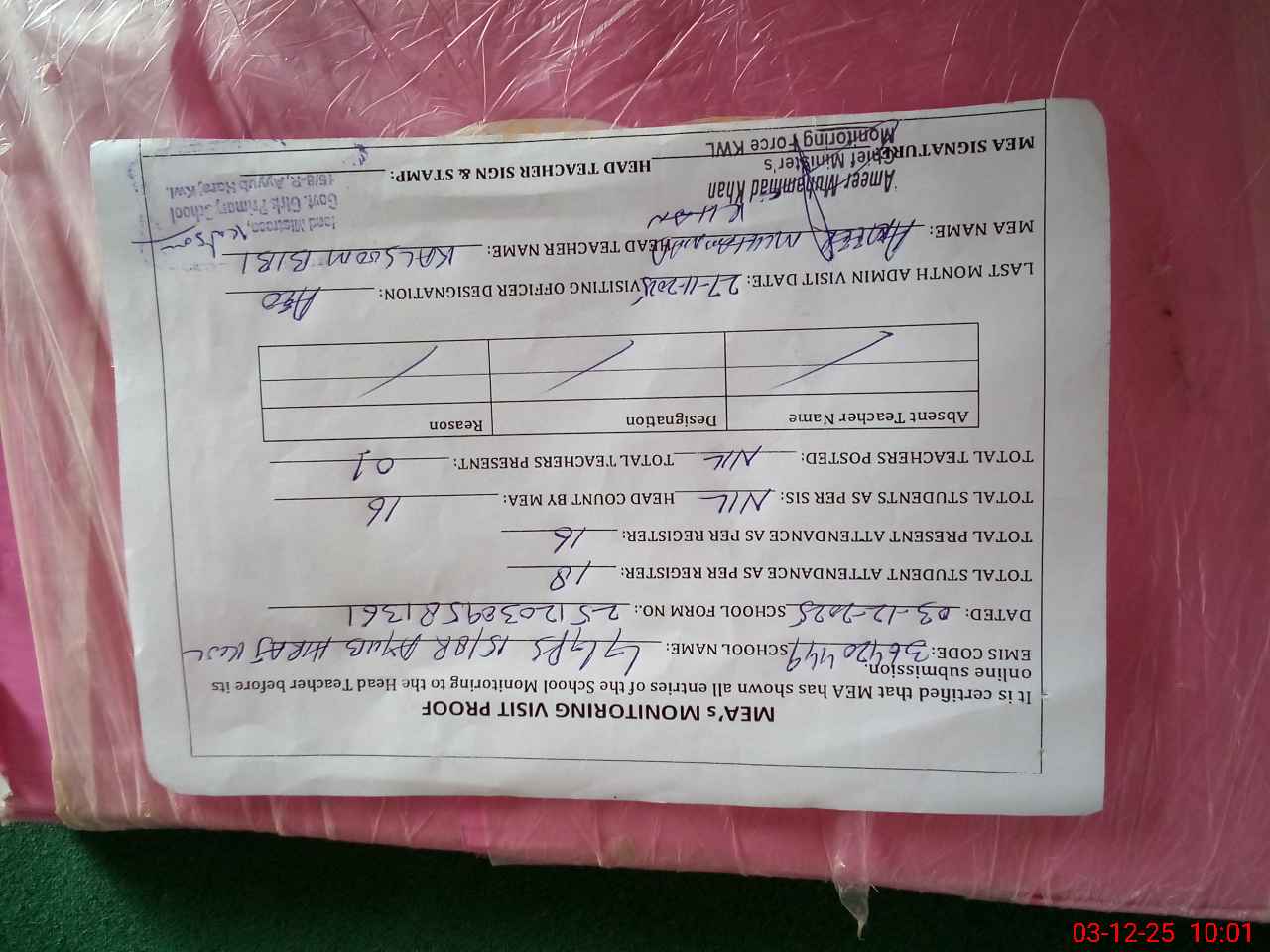 | Attendance Register | Head Teacher | MEA with School | Visit Proof |