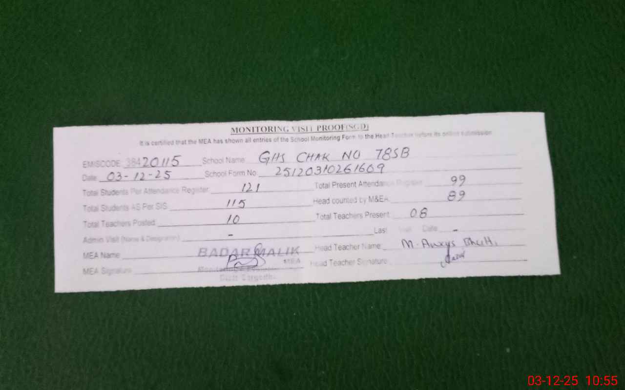 | EMIS Code: 38420115 | Name of School: GHS CHAK NO.78 SB | |||