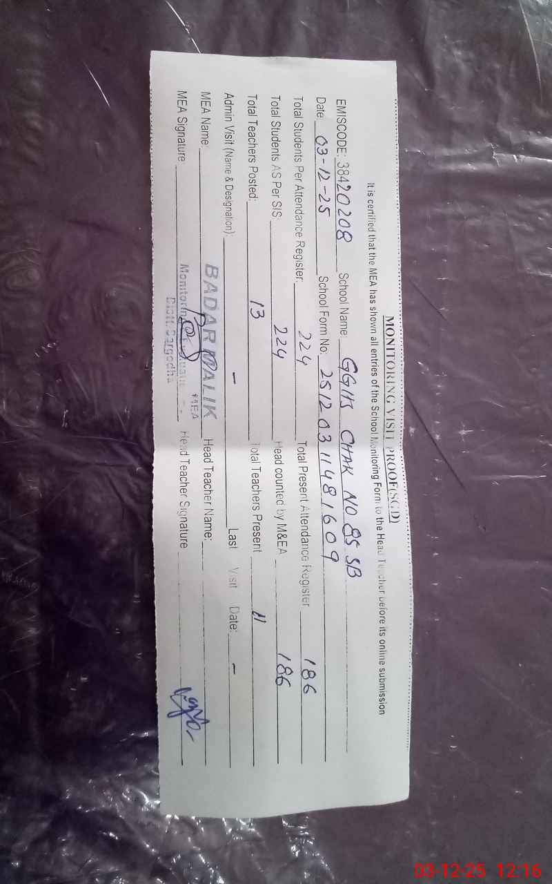 | EMIS Code: 38420208 | Name of School: GGHS CHAK NO.85 SB | |||