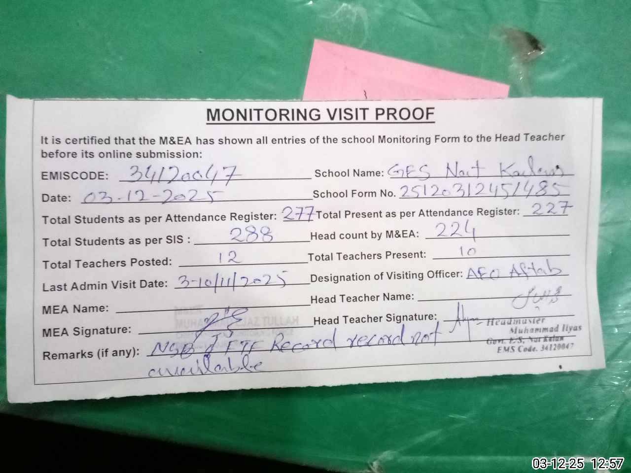 | Attendance Register | Head Teacher | MEA with School | Visit Proof |