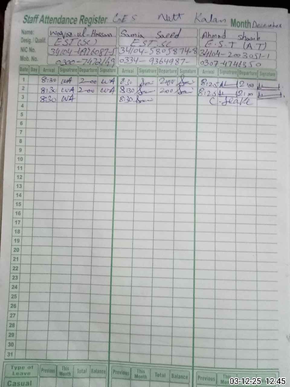 | CNIC | Full Name | Designation | R/C | Absence During Last Calender Month |