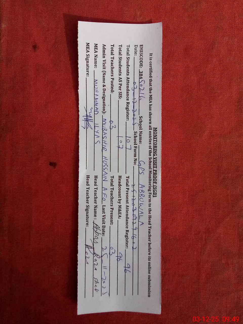 | EMIS Code: 38450216 | Name of School: GPS ABBUWALA | |||