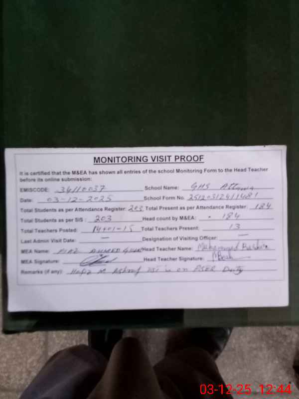 | Remarks (Use Separate Page if Required): Attendance of teaching staff and students on SIS Software is not updated Hafiz Muhammad Ashraf EST is on PSER Duty Abid Bashir EST is on the posted strength of this School but not updated on SIS Software Data as per provided by School Staff and found during physical visit | |||||