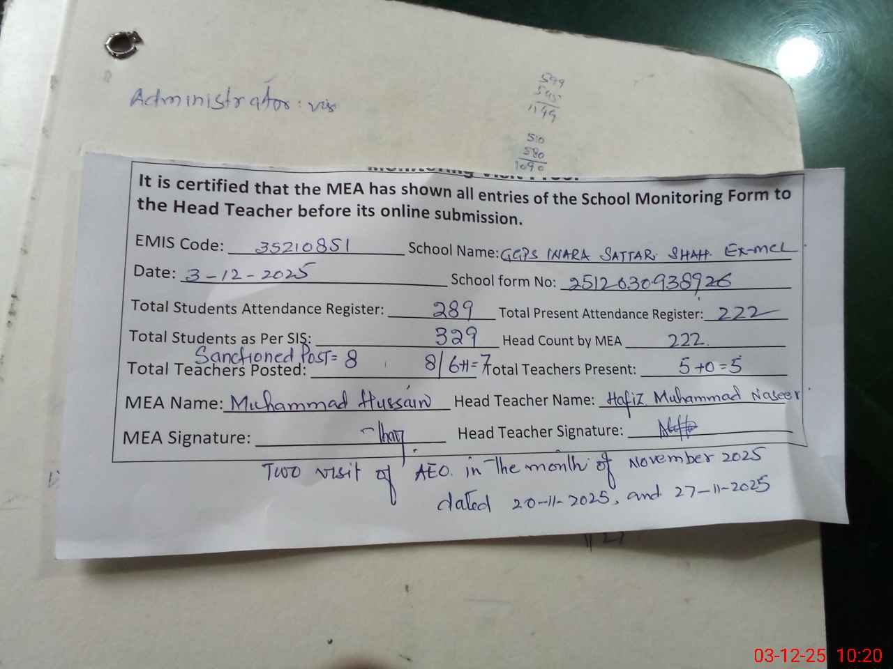 | Remarks (Use Separate Page if Required): 1 NSB data not maintain for the month of November 2025 2 FTF register not maintain for the month of November 2025 3 Class four 12 students not matching with students sitting in class 4 Books data not available | |||||