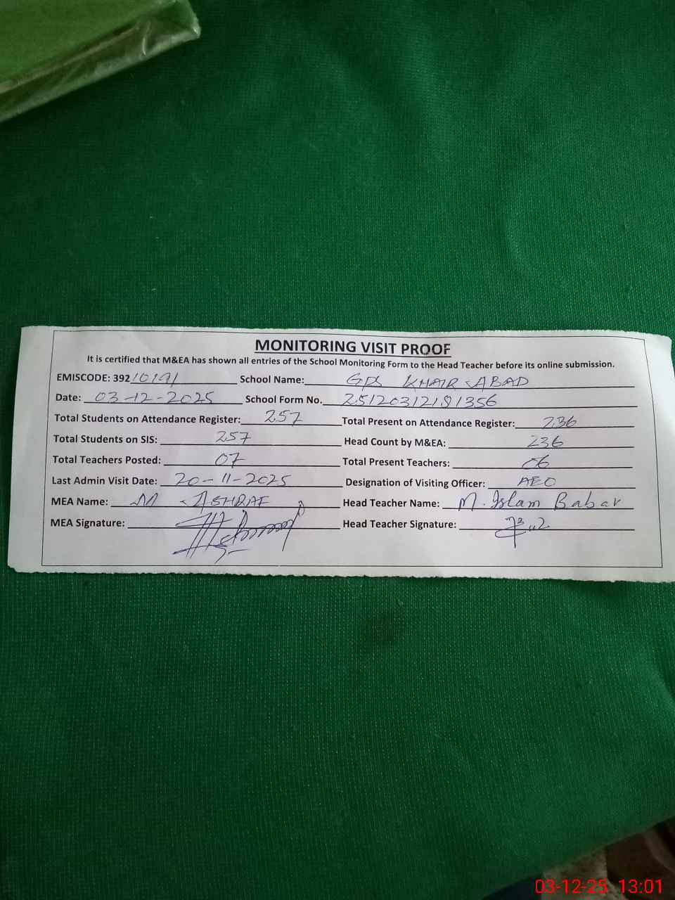 | Attendance Register | Head Teacher | MEA with School | Visit Proof |