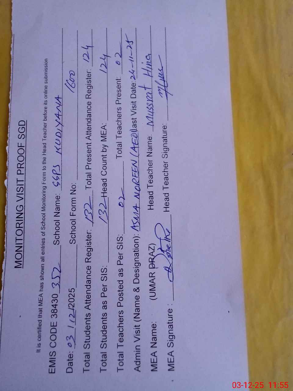 | Attendance Register | Head Teacher | MEA with School | Visit Proof |