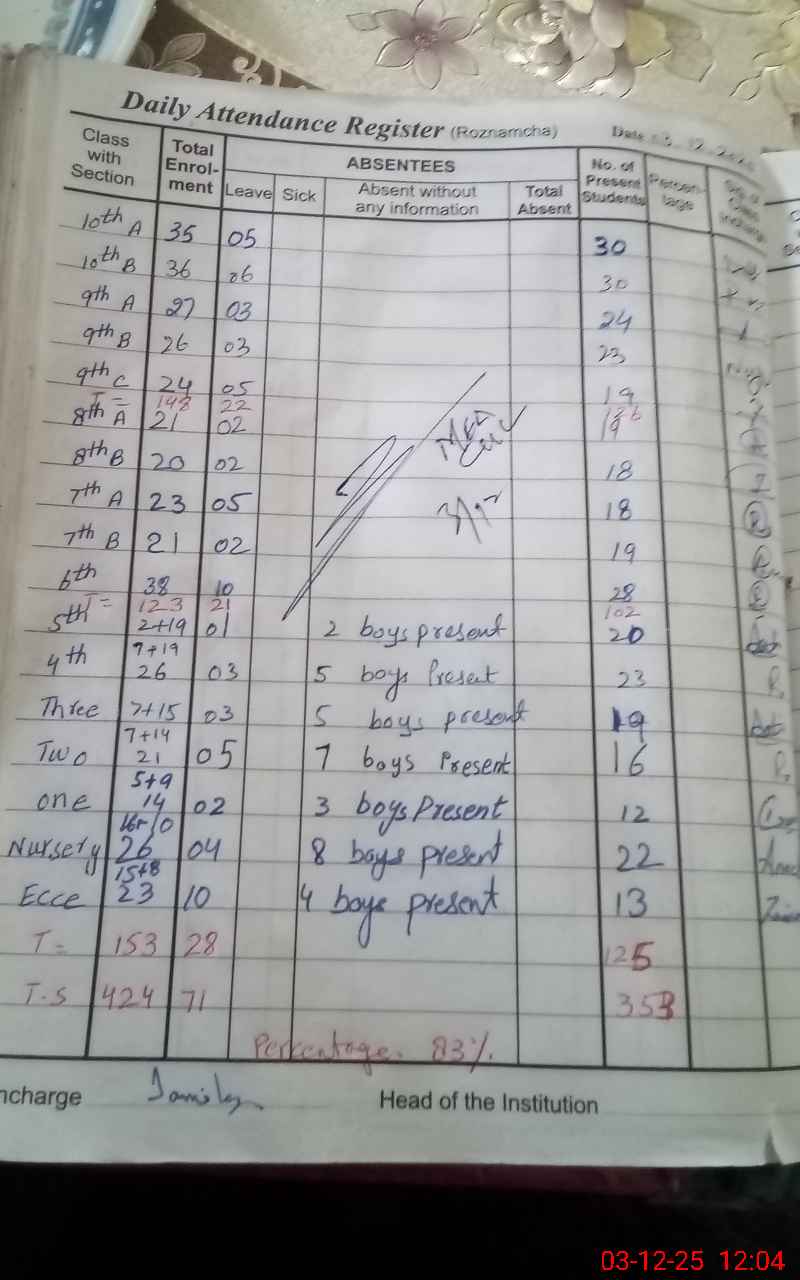 | No. of Students Present - Female | 0 | 9 | 9 | 9 | 14 | 18 | 18 | 28 | 37 | 37 | 66 | 60 | 0 | 0 | 319 | |