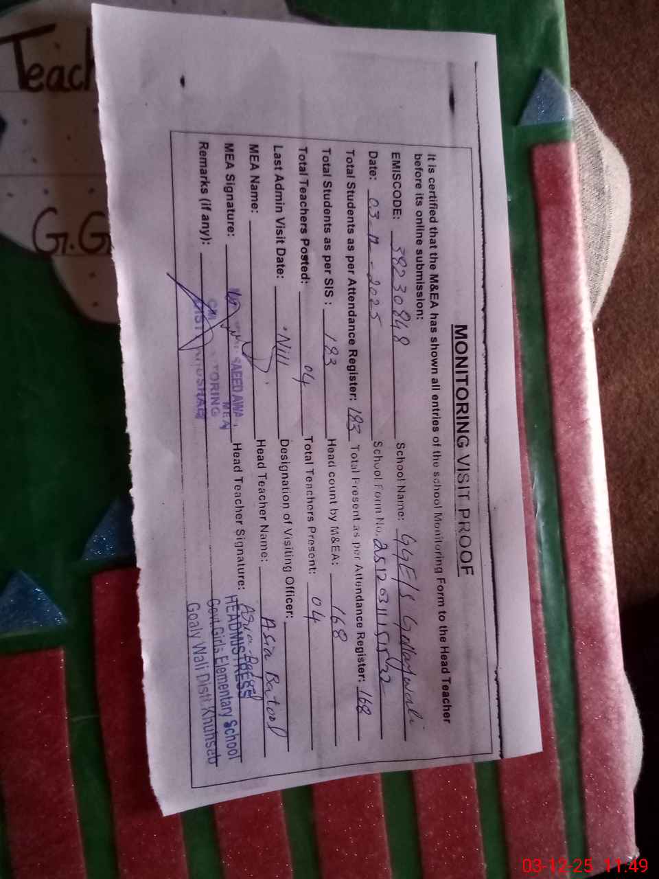 | EMIS Code: 38230848 | Name of School: GGES GOLAY WALI | |||
