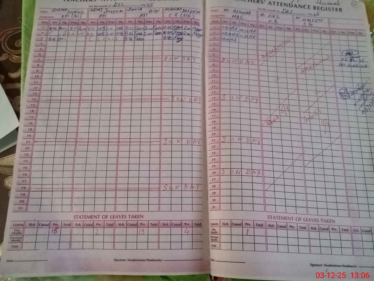 | CNIC | Full Name | Designation | R/C | Absence During Last Calender Month |
